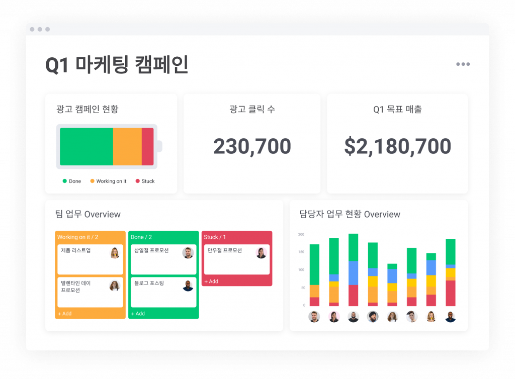 먼데이닷컴 대시보드는 실제 본부, 전사 단위로 사용 중인 회사에서 가장 니즈가 많고, 만족하고 사용하는 기능 중 하나입니다. 특히, 팬데믹으로 대면 보고가 감소하고 있는 요즘, 보다 유용하게 활용할 수 있는 기능이랍니다 😎