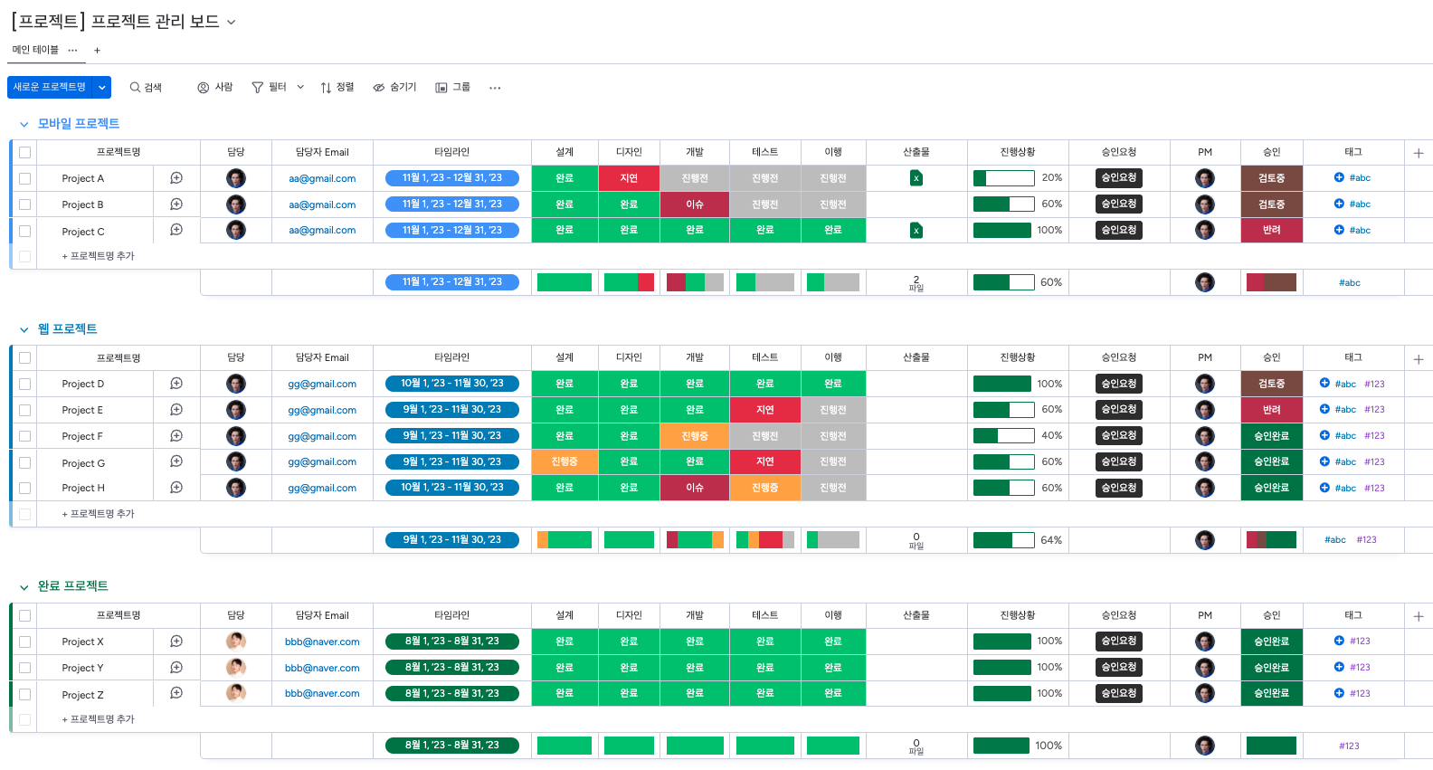 프로젝트 관리 템플릿은 단계별 현황과 타임라인을 한눈에 확인하고, 전체 진행 상황을 체계적으로 관리할 수 있도록 지원합니다. 또한 승인 및 결재 기능을 통해 프로젝트 전 과정이 명확하고 효율적으로 운영되도록 돕습니다